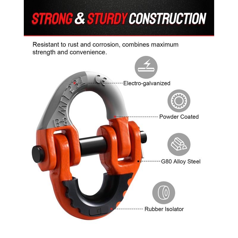 Forged from premium G80 alloy steel with electro-galvanized + powder-coated finish. Withstands 12,000 lb working load (47,000 lb break strength) while resisting rust and corrosion - even in extreme weather conditions and heavy-duty towing applications.