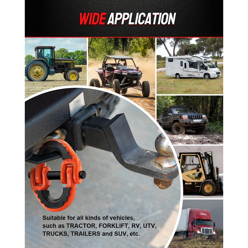 Seamlessly connects with all 1/2" chains (both SAE and metric). It is compatible with a wide range of vehicles such as tractors, forklifts, RVs, UTVs, SUVs, and trailers.