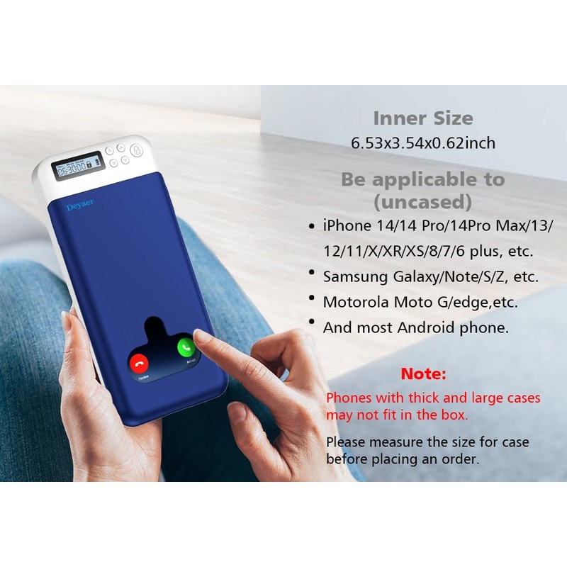 - ✅【Mini Portable Phone Safe Lock Box 】Portable phone lock box with timer internal size: 6.53 * 3.54 * 0.62inch. This cell phone lock box with timer made high-quality ABS material and easy to carry and operate. What will you get: The lock box package included: 1* Dayear lock box with timer, 1* USB-C Cable ,1* User Manual. Dayear phone timed locker box will meet different needs for you and your family.