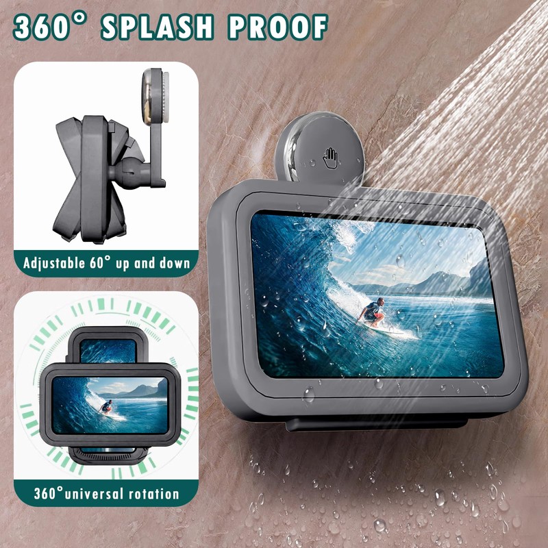 Dayinkes Shower Phone Holder Waterproof, 480° Rotating Adjustable Suction Cup Shower Phone Holder, Fog-Proof Wall Phone Stand Mount, Phone Stand with HD Touch Screen, for 4-7" Phones(Gray)