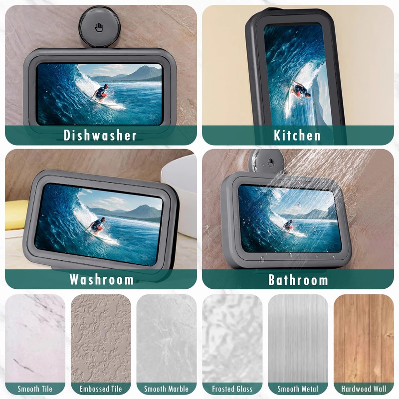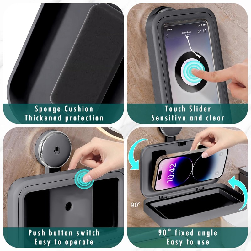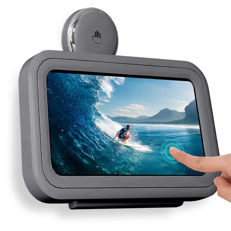 - 【HD Touch Smooth Screen】The front cover of the stand of the phone holder for shower with HD touch screen is made of high grade TPU material with internal sponge design, which can maintain the HD clarity and touch sensitivity of your mobile phone, so that you can slide the screen smoothly when you are showering or cooking in the bathroom, without affecting your using experience