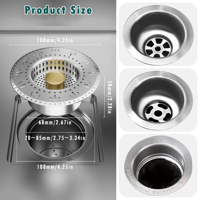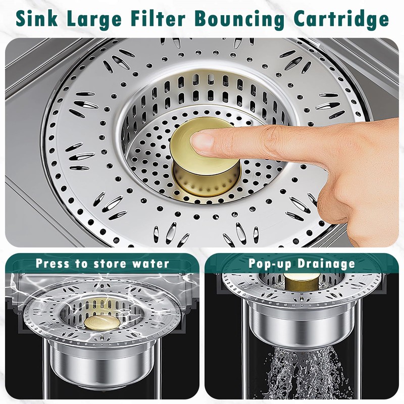 - ✅ 【Stainless Steel Pop-Up Core】This downward-facing strainer basket pops back up instantly with gentle pressure, features water storage, anti-clogging, and odor control, and the stainless steel material is perfect for busy kitchens that need to clean up food debris quickly. No more struggling with a stuck drain cover