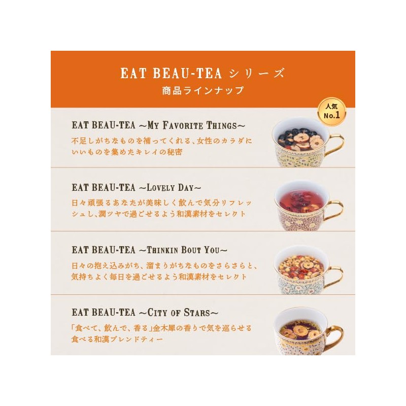 - (Fragrance and Natural Sweetness) Simply pour hot water to spread the aromatic aroma and the material will fluff. The flavor is characterized by the scent and natural sweetness, and it has a firm eating response, so it is full of satisfying feelings. The most popular tea EAT BEAU-TEA series