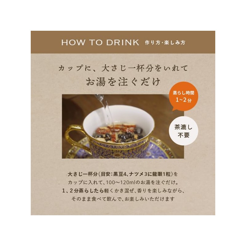 - How to eat: 1) Place about 1 tbsp (black beans 4: nutsume3 and 1 dragon eye) inside the cup. 2) Pour boiling water about 3.5 - 4.2 fl oz (100 - 120 ml); 3) Place it in place for 1 or 2 minutes, then lightly stir all the contents can be eaten and drink it