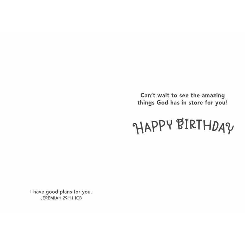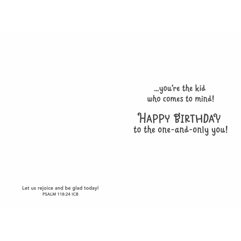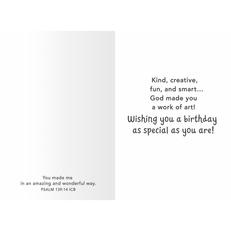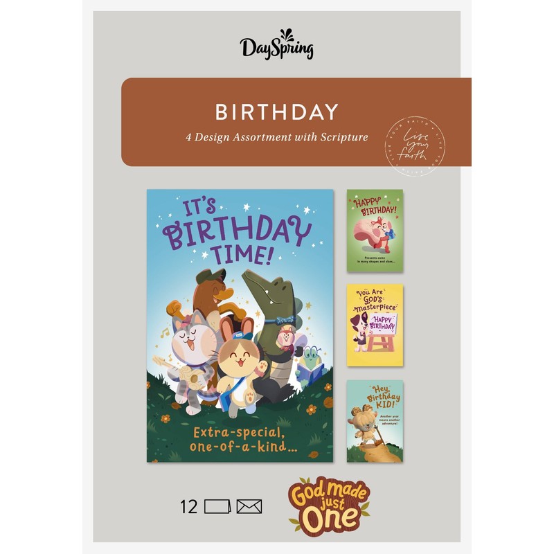 - Greeting cards are illustrated with an adorable cast of animal characters and feature the "God Made Just One" inspirational message and mixed scripture text, making each one special and inspiring for kids on their birthday