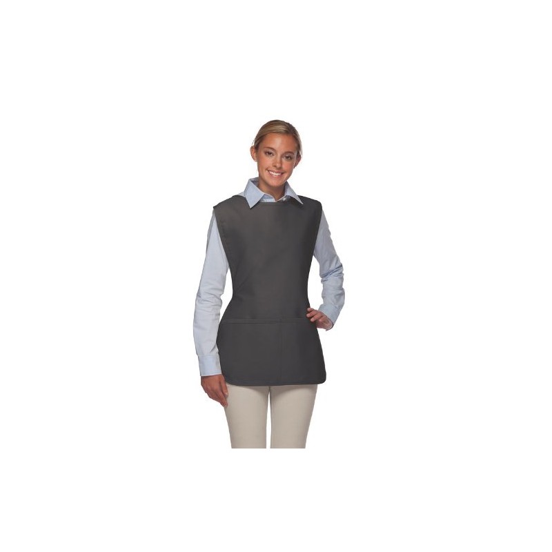 Cobbler aprons are a favorite for hospital volunteers, daycare centers, and church nurseries. It's an easily identifiable uniform that also serves to keep clothing clean. This variation has two 8" deep pouch pockets that have been divided to hold everything from tissues to keys. It slips easily over the head and has generous ties on the side.