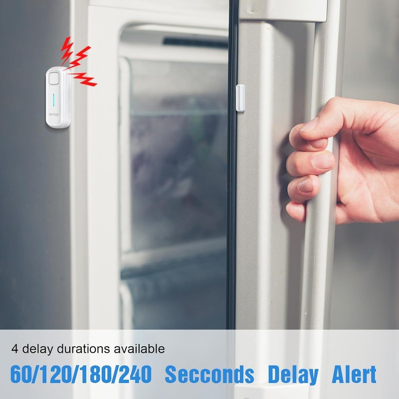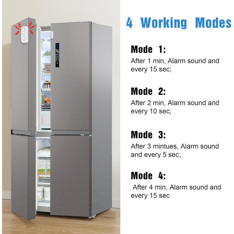 • The wireless fridge alarm is designed to alert you if the freezer door is left open for a certain amount of time. You can easily set the delay time whether it be 1, 2, 3, or 4 mins. The alarm has two ringing modes, a chime and an alarm. Additionally, you can adjust the volume level from 0dB to 120dB