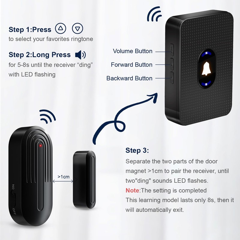 - 👏 SOME OPTIMISATIONS: the receiver's alert ringtone has been reduced to 20, the alert tone of the alarm is 5, and the chordal music is 10; 2 Ringing Modes: according to the Duration of the Ringing and Long Ringing Mode, we can pause the sound by pressing the middle button of the receiver