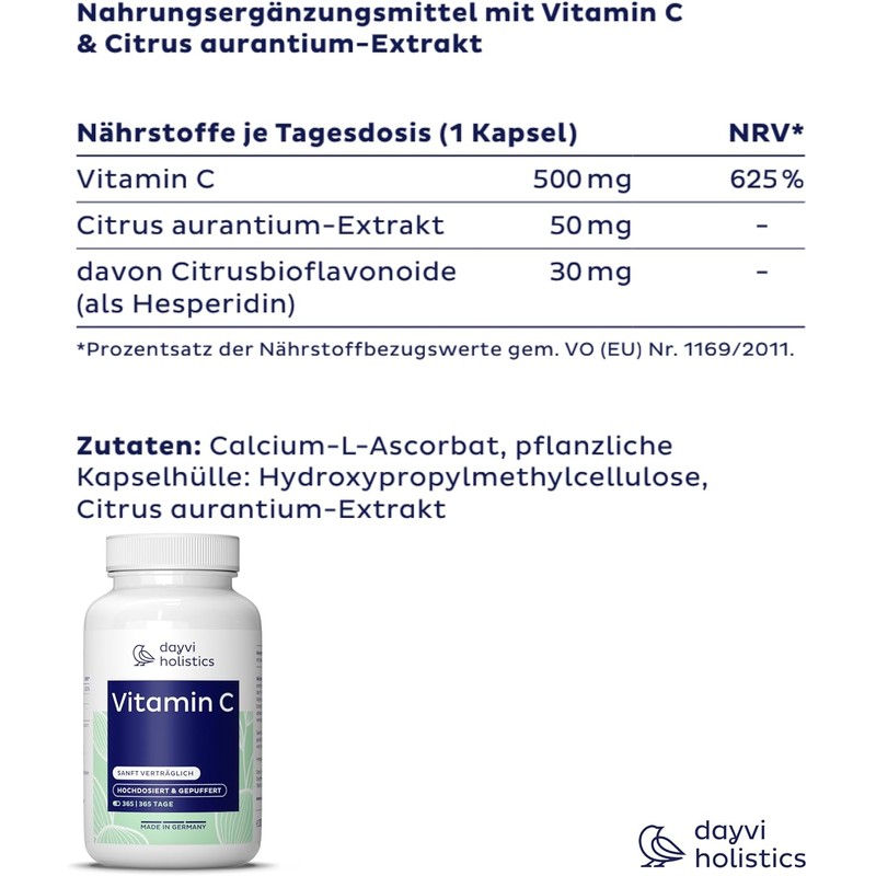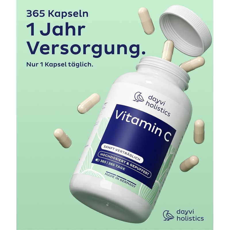 Dayvi Holistics® Vitamin C High Dose & Buffered [365 Capsules] - Vitamin C 500mg per Daily Dose