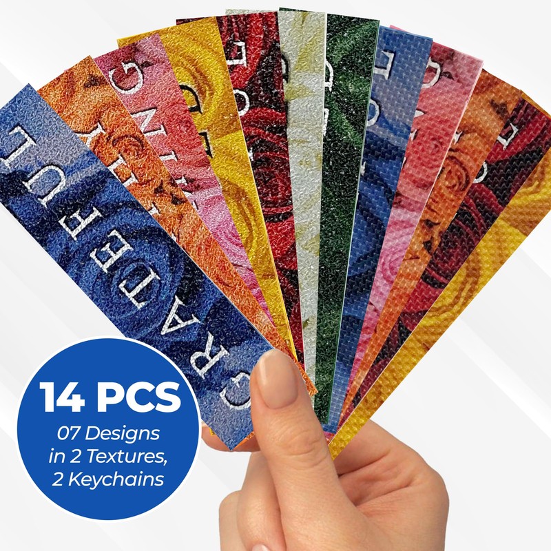 - ✨【Package Includes】Each pack contains 14 fidget toys strips encompassing 7 different designs in 2 textures and 2 keychains. Each strip thought of and designed with the intention to encourage when feeling anxious and also to inspire those around you to spark conversation with beautiful visuals and striking words.