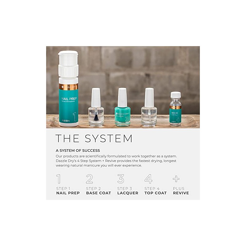 - DAZZLE DRY NAIL SYSTEM: Dazzle Dry's 4-step nail system includes Nail Prep, Base Coat, Lacquer and Top Coat. It provides the longest-lasting, fastest-drying natural nail treatment on the market.