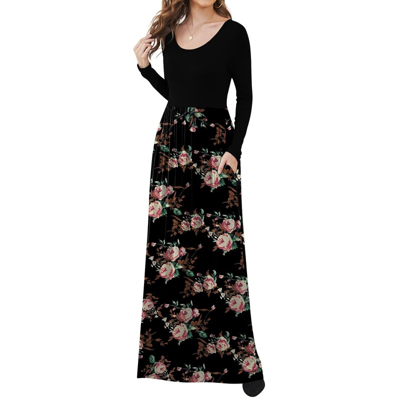 DB MOON 2024 Women Casual Fall Long Sleeve Maxi Dresses Empire Waist Long Dress with Pockets Flower Rose Black L