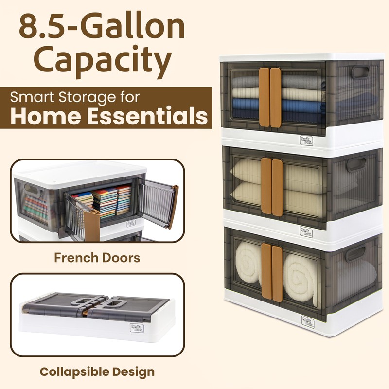 dbest products Quik Box - 8.5 Gallon 3 Pack Stackable Storage Bins with Doors, Collapsible Organizer Foldable Container, for Bedroom Living Room Neat, Tidy Dorms and Organized Homes, Boxes