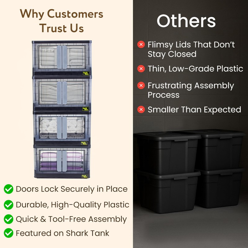 - Durable Material: Made from high-quality plastic, our Quik Box is built to last. These collapsible storage bins with lids are designed to withstand the test of time, making them the perfect choice for your storage needs.