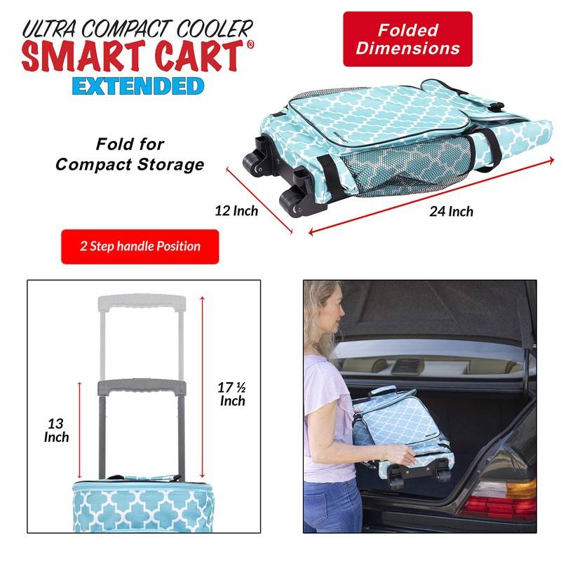 We took our best selling cooler with wheels the Ultra Compact Cooler Smart Cart and we extended it for more capacity and bigger pockets and beverage holder. Pack the Ultra Compact Cooler Smart Cart Extended with groceries, food, drinks or whatever you need to keep fresh. Why haul a heavy bulky hard sided cooler when you can roll this lightweight cooler on wheels. Collapsible design allows you fold this beach cart and store for compact storage while taking the minimal space possible. This multi-purpose folding basket is perfect and convenient for anyone on the go! unlike an ordinary cart this cooler cart has wheels and an extendable handle for easy maneuverability. It has a large front zipper pocket for easy access items and securely store keys phone and wallet. Nice small design makes it great use as a lunchbox.