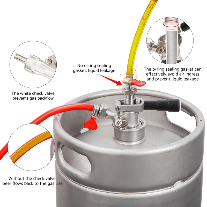 The white check valve prevents beer backflow and the sealing washer can effectively avoid air ingress and prevent liquid leakage