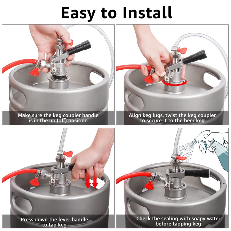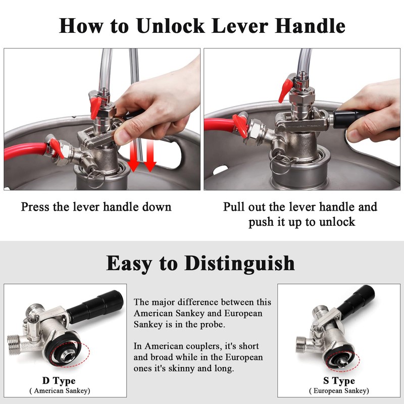 • 【Easy Install & Use the D Coupler】The beer keg coupler d system has a G 5/8'' thread that can be used for ball lock quick disconnect with the help of keg coupler adapter, features a black lever style handle, which is more flexible than standard wing handle. Tighten G 5/8'' hex nut to keg coupler with the help of tap wrench. Just align keg lugs, turn and twist coupler to secure it to beer keg, then push the handle down and it is in working condition for dispensing beer.