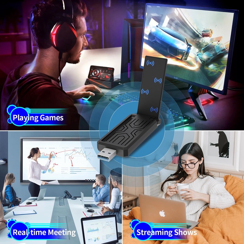- Adaptador Wi-Fi USB de tribanda AX5400 para mejores conexiones La velocidad inalámbrica de 2,4 GHz/574 Mbps, 5 GHz/2402 Mbps y 6 GHz/2402 Mbps permite el acceso a Internet de alta velocidad con la revolucionaria tecnología OFDMA y MU-MIMO, funciona bien para videos 4K, juegos, música, Skype, transferencia de archivos grandes, etc