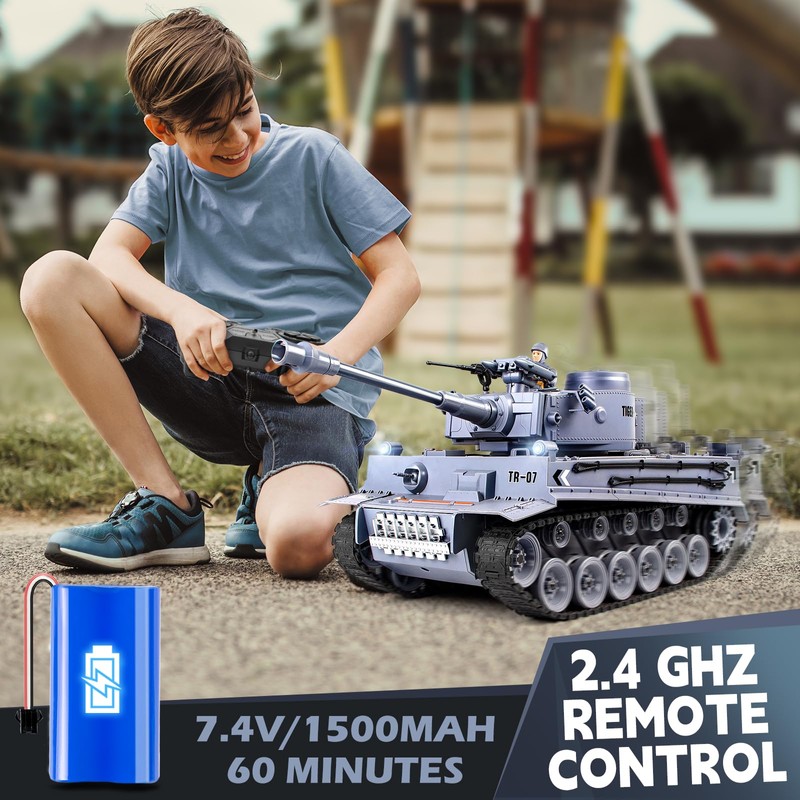 - 【 7.4V/1500mAh Rechargeable Battery 】 The 7.4V/1500mAh rechargeable lithium battery takes 1-2 hours to charge and support playing about 60 minutes. 2.4Ghz remote control within a range of 150 feet, and allowing tanks play together without interference. Remote control needs 3 AA batteries (not included).