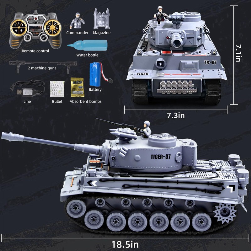 - 【 Packing List 】1: 18 Remote control tank x1, 2.4 GHz remote control x1, rechargeable battery x1, BBS x1, water bomb x2, Soldier × 1, Prop gun × 2,Manual × 1, Target × 1. It is a great gift for Birthday, military collectors, Halloween, New year. Great rc vehicles military toys for adults and 6+ kids.