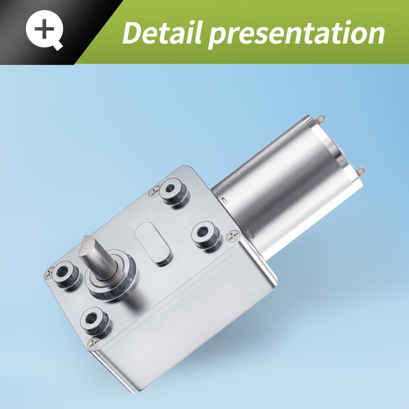 • Feature - The motor is Gear DC motor with micro-turbine worm, you can change the wiring-connection to change motor rotation. -Turbo worm geared motor with self-lock, that is, in the case of motor without electric, the output axis is fixedand self-locking. -The output shaft of the whole motor body is relatively short in the direction of normal speed reducer, and it is widely used in some situations where the installation dimension is required.
