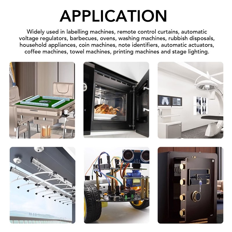 1、CW, CCW: DC gear motor with a micro turbine worm, the motor can change the motor rotation by changing the wiring connection. 2、SELF LOCKING FUNCTION: The motor has a self locking function, and the output shaft is fixed when the motor is powered off. 3、EASY INSTALLATION: The output shaft is arranged vertically with the motor shaft, which is shorter and suitable for different scenes that require special installation sizes. 4、WIDELY USED: Motors are suitable for label machines, remote control curtains, automatic voltage regulators, barbecue ovens, ovens, washing machines, garbage disposal machines, household appliances, coin machines, currency recognizers, automatic actuators, coffee machines, towel machines, printing machines, and stage lighting. 5、ZINC ALLOY SHELL: Using strong zinc alloy shell, good toughness, impact resistance, the service life of the worm gear motor are improved, extremely durable.