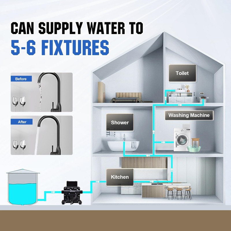 - High Performance:Brushless water pump runs continuously for 24 hours and has a life span of up to 20,000 hours, 2.5 times longer than comparable brushed ones. Flow rate of 6.0 GPM; Self-priming height of 9.8 FT; Vertical lift height of 147 FT; Max. amps of 1.6 A