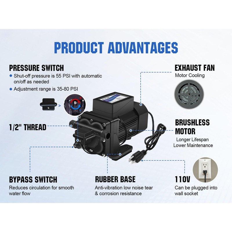 DC HOUSE Brushless 110V Water Pressure Transfer Pump 6.0 GPM 55 PSI Self Priming On Demand Electric Water Diaphragm Pump 110 Volt AC for Home Garden Irrigation Rain Barrel Pool