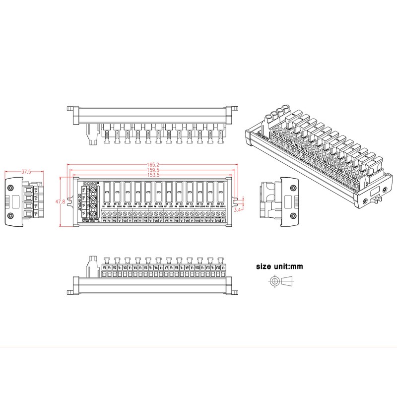 - Input terminals pitch 7.62mm/0.3", maximum current 30 Amps for per position, wire size 26~10 AWG, stripping length 8mm, Metric M3 slotted screw. Support power supply expansion connect to other modules.