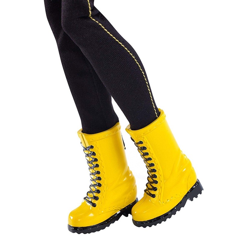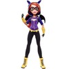 - Batgirl doll wows wearing a sleek outfit with Batgirl symbol details, a tech pattern on her shirt, golden boots and bat-inspired mask and hood.