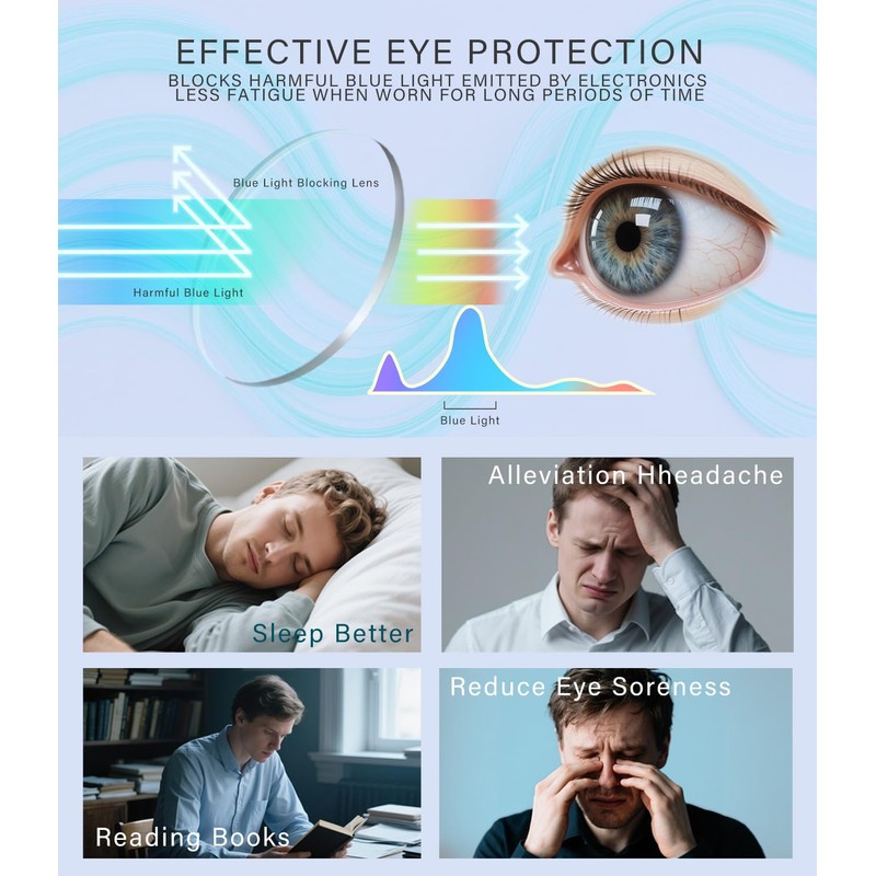 - 【Eye protection while precise focusing】 The lens is equipped with a blue light filter, and the substrate is embedded with an anti blue light layer, blocking 35% of harmful light from electronic screens and reducing eye fatigue from prolonged reading. Unique progressive multifocal lens design, with gradually changing degrees in the upper and lower lens areas, eliminating the need for frequent lens changes for reading and long-distance viewing.