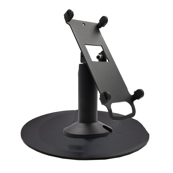 Manufactured in sturdy steel with durable powder coated finish Essential to enhance customer experience stand can tilt up to 60° and swivel a full 190°, making moving device from customer to merchant easier; improves payment transaction Ultimate convenience for merchant and customer; designed to bring terminal closer to the customer; stand is upgradeable in the field with a simple top plate swap; stand is compatible with any round or square Discount Credit Card Supply freestanding plate Stand allows for seamless customer interactions with less danger of harm to equipment; flange cover hides wires and mount keeps terminal secure for minimized chances of damage and theft to POS terminal; durable powder coated finish protects stand Includes 8" x 8" round countertop plate which increases flexibility and allows the mount to be freestanding. Simply screw the stand to the plate with enclosed screws. Swivel and tilt stand is supplied fully built for a simple installation; two easy installation methods; includes screws and an adhesive pad for two options of securing holder; terminal not included; fits Dejavoo P3; pole stands 5.5” tall