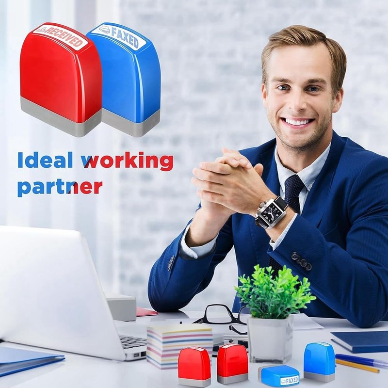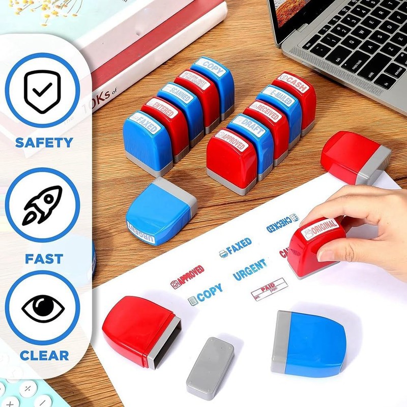 - Office Stamp Set You will get 16 pcs desk stampers, including 8 blue and 8 red ink. It is designed with basic phrases you need for your work. Replacement supplies