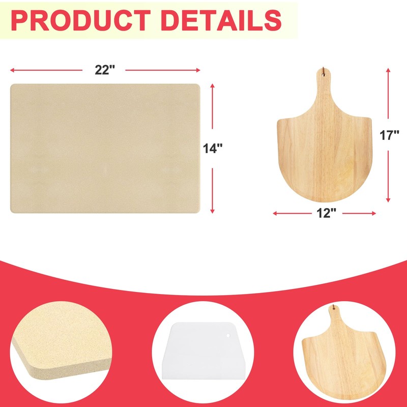 DcYourHome Universal Extra Large Pizza Stone for Oven BBQ Grilling, 22" x 14" Natural Cordierite Rectangular Baking Stone Pizza Making Accessories with Wood Pizza Peel Plastic Scraper for Baking Bread