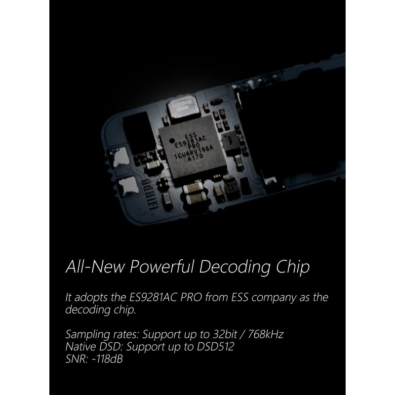 - All-New Powerful Decoding Chip: It adopts the ES9281AC PRO from ESS company as the decoding chip. Sampling rates: Support up to 32bit/ 768kHz ,Native DSD: Support up to DSD512, SNR: -118dB