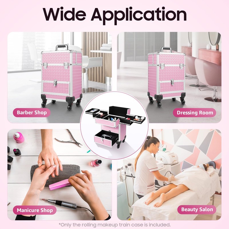 - Premium Material: This case is made of aluminum alloy, ABS, density board, and flannelette, making the product durable, and not easy to deform and rust, so it can keep beautiful and practical for a long time, and you don't need to replace it frequently. This rolling makeup train case can be widely used by hair stylists, pet groomers, makeup artists, and so on for storing scissors, makeup, jewelry, combs, and other items.