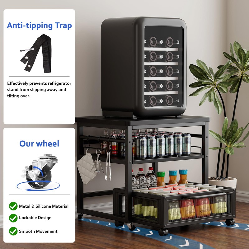 - Premium Metal Wheels with Locking Design: Equipped with durable metal wheels, this mini fridge stand offers smooth mobility. Once in place, simply engage the locking mechanism to secure the stand, ensuring it stays stable and won't shift during use.