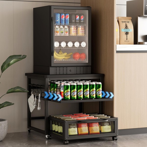 - Movable Bottom Basket: The mini fridge stand includes a practical movable bottom basket, perfect for storing additional items like cans, bottles, or kitchen tools. Adjust its position based on your storage preferences for easy organization and accessibility.