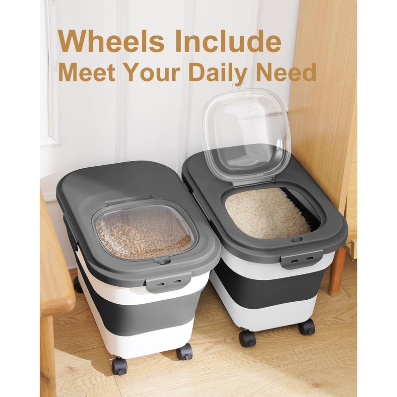 DDMOMMY 20-30 Lbs Rice Storage Container,Collapsible Food Storage Containers with Rolling Wheel Airtight Locking Lid,Flour Storage Container with Cup and Scoop,Suitable for Food,Rice,Pet Food,Flour