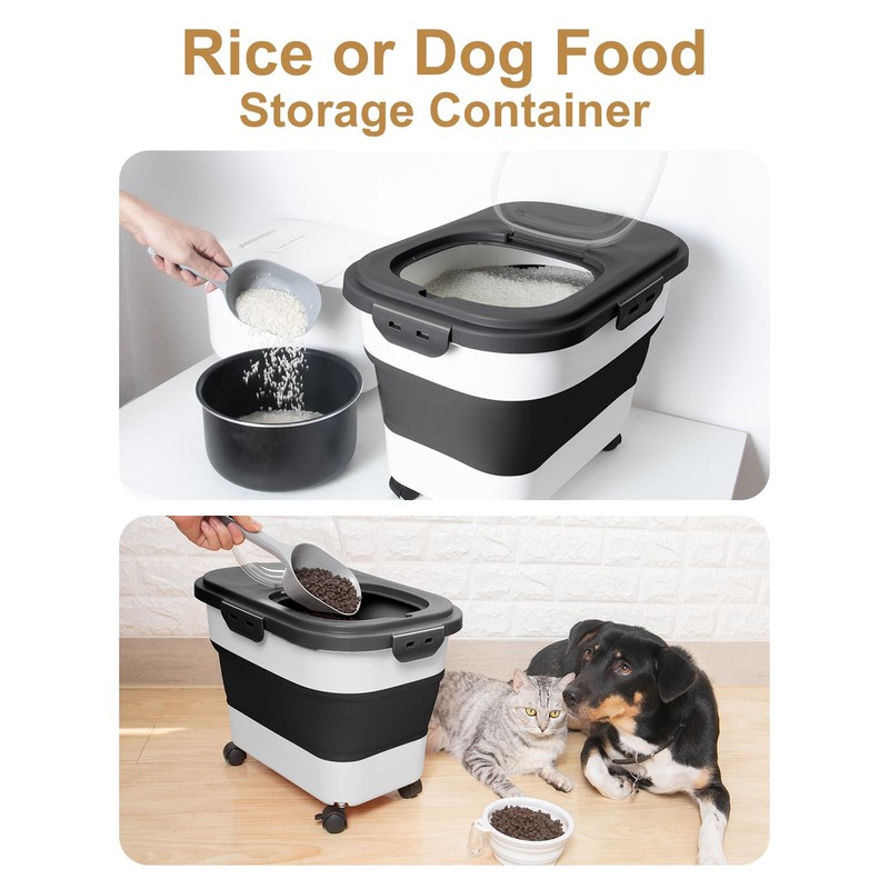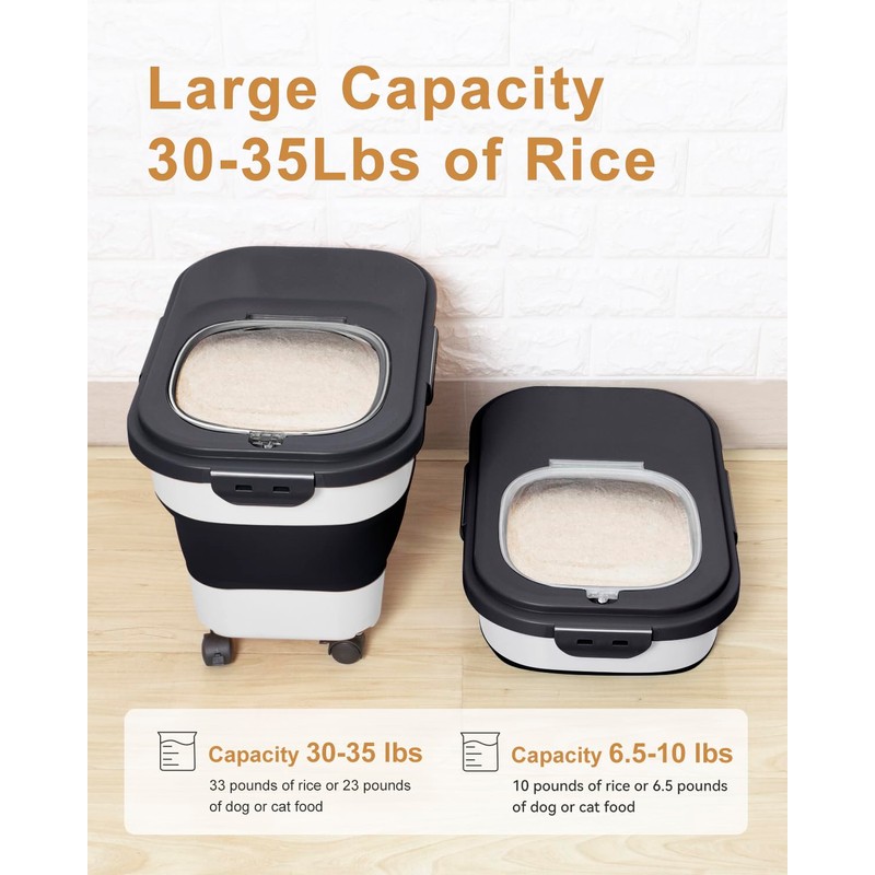 • Space Save & Extra-large Size: This rice container can hold 20-30 lbs of rice or 20-23 lbs of pet food.Unfolded size:16.54"L x 10.15"W x 12"H, suitable for storing 35 pounds of rice or 23 pounds of dog food.Folded size:16.54"L x 10.15"W x 5.5"H,can hold about 10 pounds rice or 6.5 pounds of dog or cat food.