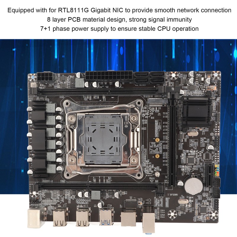 1、Dual Channel DDR3: The gaming motherboard has two DDR3 memory slots, supporting both normal memory and ECC server memory. Memory capacity up to 32GB , memory type. DDR3 1066/1333/1600MHz. 2、32Gbps: Dual M.2 hard drive interface, can support NVME M.2 and SATA M.2 interface types, PCIe 3.0 standard, data transfer speeds up to 32Gbps, full solidly capacitor design power supply cooling block, good heat dissipation, 24pin and 8pin power connector. 3、Scope of Application: Motherboard for LGA 2011 V3 socket, supports 5th 6th generation for Intel for Core i7 processors and for XEON E5 V3/V4 series processors. For example, for E5 2650 V3, E5 1650 V4, E5 2698 V4, i7 6900K, i7 5930K, etc. 4、With Gigabit LAN: The motherboard is equipped with for RTL8111G Gigabit LAN card to provide glossy network connectivity, 8 layer PCB material design, strong signal immunity, 7+1 phase power supply to ensure stable operation of the CPU. 5、Multiple Expansion Slots: Expansion slots include one PCIE X16 graphics slot, one PCIE X1 slot, six USB 2.0 slots, two USB 3.0 slots, four SATA 3.0 slots, two for PS/2 slots, and one NVME M.2 interface.