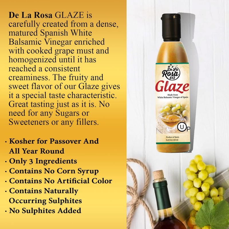 - USDA And Kosher Certified Addition: Discover great taste with a healthy diet by adding De La Rosa Real Foods white balsamic glaze to your daily meals. Made with only the finest ingredients, our glaze is USDA-certified, vegan, gluten-free, and non-GMO. Plus, it's Kosher certified, making it a healthy and versatile addition to any kitchen