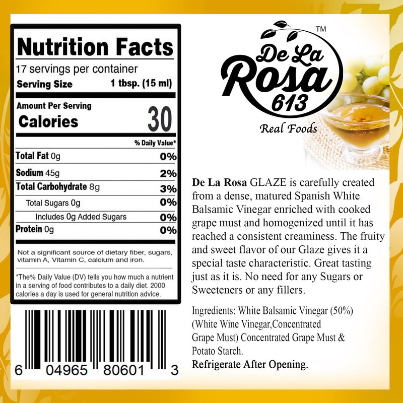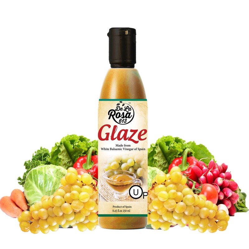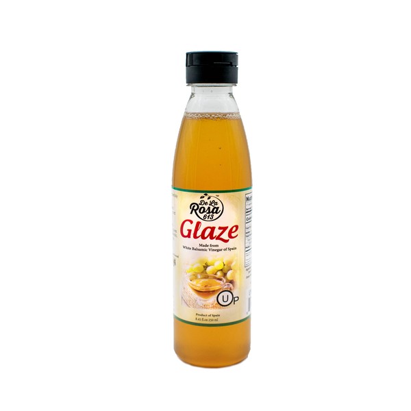 - The Perfect Taste With Simple Ingredients: Looking for a way to add a touch of elegance to your dishes? Look no further than De La Rosa Real Foods White Balsamic Glaze! Our glaze is made from the finest Spanish White Balsamic Vinegar, cooked grape must, and a touch of homogenization to achieve a silky-smooth consistency. Our Non-GMO Balsamic Glaze has three simple ingredients: Balsamic Vinegar (50%), Concentrated Grape Must, and Potato Starch