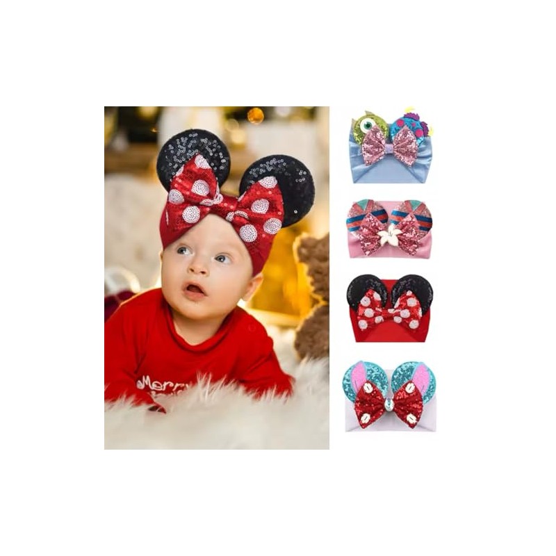 - Encantadora banda para bebes que combina elegancia y diversión. Confeccionada con material suabe que da comodidad al bebe, pudiendo usar por periodos largos sin apretar su cabecita, presenta dos adorables orejas de raton decoradas con lentejuelas plateadas que brillan con cada movimiento.