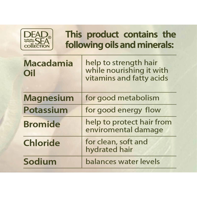 This generously sized bottle of Shampoo contains Macadamia Extracts and Natural Dead Sea Minerals that will help to strengthen your hair while nourishing it with fatty acids reviving and moisturizing it. This product contains the following ingredients & minerals: Macadamia Oil helping to protect hair while nourishing it with fatty acids. Magnesium for good metabolism. Potassium for good energy flow. Bromide helps to protect hair from environmental damage. Chloride for clean, soft and hydrated hair. Sodium that balances water levels. For a complete hair treatment and optimal results, we recommend following with Macadamia Mineral Conditioner. This will help to nourish and replenish your hair’s natural moisture leaving it looking shiny and full of luster. This shampoo and conditioner rich in oil and natural minerals were created to work together to provide your hair the perfect helpers for rejuvenating and rehydrating each strand, aiding your hair’s natural luster and silky radiance and shine to return. Our Dead Sea Collection products are available for your skincare needs as well as your bath and body care. These products are not tested on animals, have a shelf life of 24 months from opening, and come in recyclable bottles.