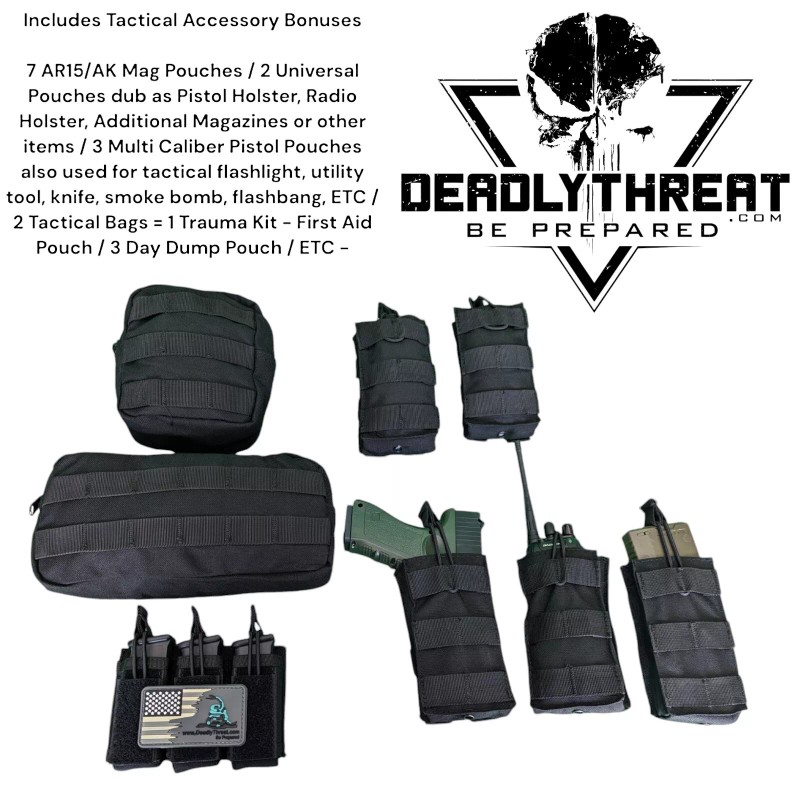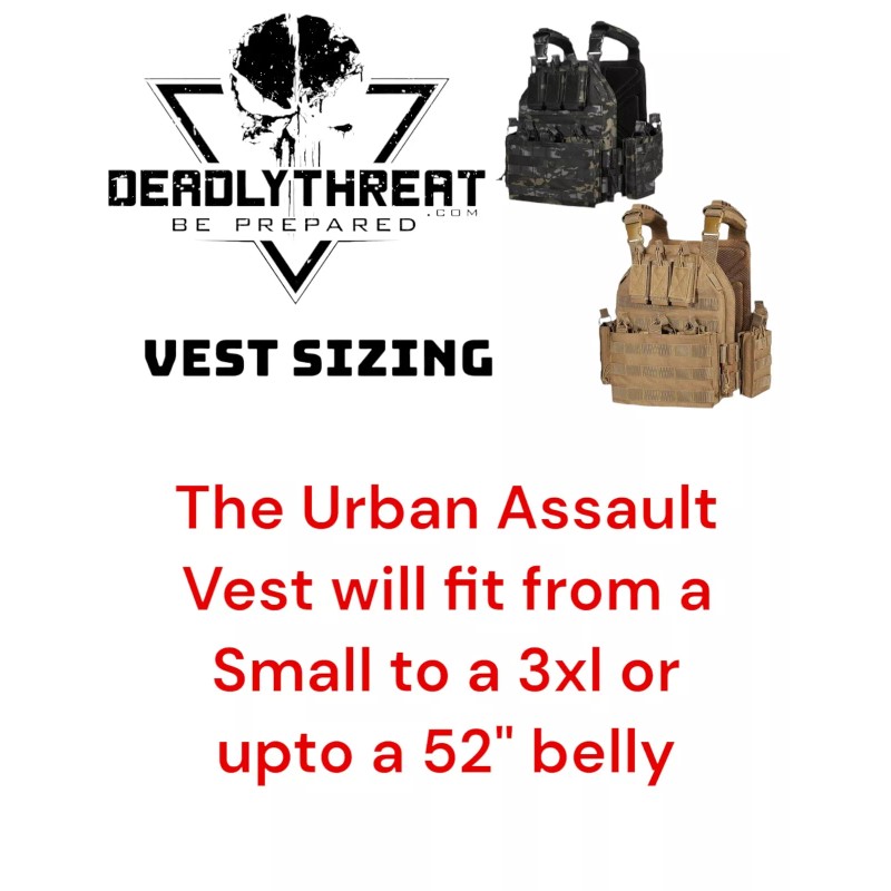 The Ultimate ProtectionThis premium plate carrier does it all. Equipped to take down any threat, the Urban Assault accommodates a forceful loadout while maintaining unrestricted mobility. If you’re serious about surviving tomorrow, get it today.Stay Low - Move Fast - Save LivesCombat Proven Battle validated on 3 war fronts including Iraq, Afghanistan, and the Ukraine Extreme Quality Parachute grade materials, stitching and Velcro throughout Multifunction Versatility Strip it down and wear it low profile, or equip it with a massive loadout - It's ready for your personal mission Tactical Accessory Bonuses 7 AR15/AK Mag Pouches / 2 Universal Pouches dub as Pistol Holster, Radio Holster, Additional Magazines or other items / 3 Multi Caliber Pistol Pouches also used for tactical flashlight, utility tool, knife, smoke bomb, flashbang, ETC / 2 Tactical Bags = 1 Trauma Kit - First Aid Pouch / 3 Day Dump Pouch / ETC - Built in Trauma Pads 10mm High Density Neoprene Padding is sewn into the vest at the factory Expert Plate Pockets Military grade stirrup retention system solidly holds every type of 10x12 plate Shoulder Straps Shotgun Shell receptacle, Communication Wiring receptacle, and/or Hydration Pack straw tube receptacle Comfort Fully padded – Fully Adjustable Breathability Quick drying wick-away anti-sweat materials Perforations and cutouts for additional airflow Broad Sizing Fitment Fits Sm - XXXL 28” to 54”’ Waist Armor is NOT included at this price If armor is desired in conjunction with your carrier, please visit our Protection Packages section here: Protection Packages WE DO NOT SHIP TO CONNECTICUT AND NEW YORK STATE Legal Terms and Conditions for Purchase and Use You represent, warrant, and confirm all of the following: You are 18 years old or older / You are not a felon / You are not under indictment for any felony / You are not disqualified from purchasing, possessing or using items sold by Deadly Threat, Inc. / You are legally allowed to possess and use these items in your state, province or territory of residence / You are not purchasing these items for criminal intent or purposes / You will not commit crime with or use Deadly Threat, Inc products for unlawful purposes / You support law enforcement and do not support defunding police departments / Items purchased are for your use only and you are not making a purchase on behalf of someone else in order to avoid the terms and conditions herein / You fully understand that body armor in any capacity is not guaranteed to be bullet proof and is only bullet resist / You are solely responsible to comply with all local, state and federal laws regarding the purchase and use of all Deadly Threat, Inc. products further agreeing to be bound by the terms and conditions herein / You understand that bullet proof is a relative term and there is never a guarantee of any kind or nature that indicates rounds will not penetrate any level of armor regardless of threat protection / You can be struck and injured or even killed while wearing body armor including ricochets / You understand that anytime a firearm or bullets are used there is a chance of injury or death and you assume this knowingly taking on this risk of your own accord / You assume all the risk while using or misusing, whether for its’ intended purposes or not, any and all products sold by Deadly Threat, Inc. / You will never perform testing of any kind or nature on any of Deadly Threat, Inc Armor either by free standing it or while wearing it yourself or having someone else wear it / We do not accept nor promote productions of any kind demonstrating irresponsible behavior as described herein / You are solely, legally and criminally liable for your actions while using or promoting Deadly Threat, Inc. products / You and anyone who comes in contact with our products must agree entirely for yourselves, your families, your agents, your heirs and your associates of any kind or nature to fully release, indemnify, hold harmless, never bring action in a court of law, and defend against any liability resulting from your purchase, possession and use of any and all Deadly Threat, Inc products / Violations and not following any of these terms and conditions herein may result in severe legal consequences, financial burdens and incarcerations / This is not the entirety of your responsibility / You are a US citizen / Deadly Threat, Inc. will cooperate with criminal investigations by law enforcement on all levels and at all times / These terms and conditions are prominently displayed on all avenues for purchase including websites, storefronts, trade shows, gun shows and you acknowledge adequate access to the same / These terms and conditions are subject to revision without notification / No warranty is unlimited and is 100% at the sole discretion of Deadly Threat / Warranty is not offered for usage in connection with criminal activity, riot scenarios, combat type events, or war-time prevelance / Connecticut residents may not purchase Deadly Threat, Inc. body armor except in person / Only Law Enforcement in NYS may purchase or possess body armor / Deadly Threat, Inc. sells only in the USA and we are not exporters of any kind or nature / You agree that you are buying our products solely for USA use / All sales are final. No refunds. No cancellations / These terms and conditions are subject to change without notice and may even be upgraded without written expressionThe Ultimate Protection