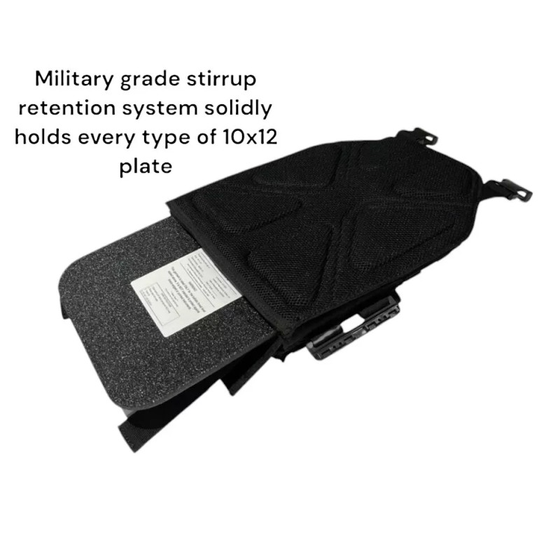 Military grade stirrup retention system solidly holds every type of 10x12 plate