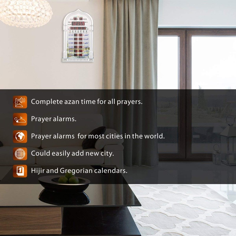 #Could easily modify the difference time prayer to the outskirts of cities adopted it. # Prayer alarms to reminders of Iqama or salat time for all prayers. #Full screen LED light Snooze option.Temperature. Daily alarm. #The possibility turn on or off azan sound imposed on all alone. #Complete azan for all prayers(with volume control). #Hijri and Gregorian calendars. #Daylight saving time option. Ditigal muslim prayer clock for sale islamic azan muslim prayer clock HA-4008 ? Azan sound for all prayers(with voume control) ? Azan times for all cities around the world ? Fajr alarm,adjust automatically everyday ? Daily alarm(weekends optional) ? Special extra alarm ? Qibla directioon(relative to North) ? Hijr and Geregorian calendars ? Temperature display ? Daylight saving time option ? Snooze option ? Full screen Light ? Volume control switch ? 1 year guarantee Features: 1. Full azans(1150 cities around the world) 2. One high quality Azan sound (Makkah) 3. Temperature display 4. Weight with two-round charger 5. Hijri&Gregorian Calendars 6. Prayer alarms to remind of all prayers at Iqama or salat time 7. The possibility turn on or off azan sound imposed separately 8. Special alarm to wake up works automatically tiwh the possibility of closure 9. Could use easily according to international dialing code especially in Alharameen 10. Could modify the difference prayer time easily in the outskrts of cities adopted it