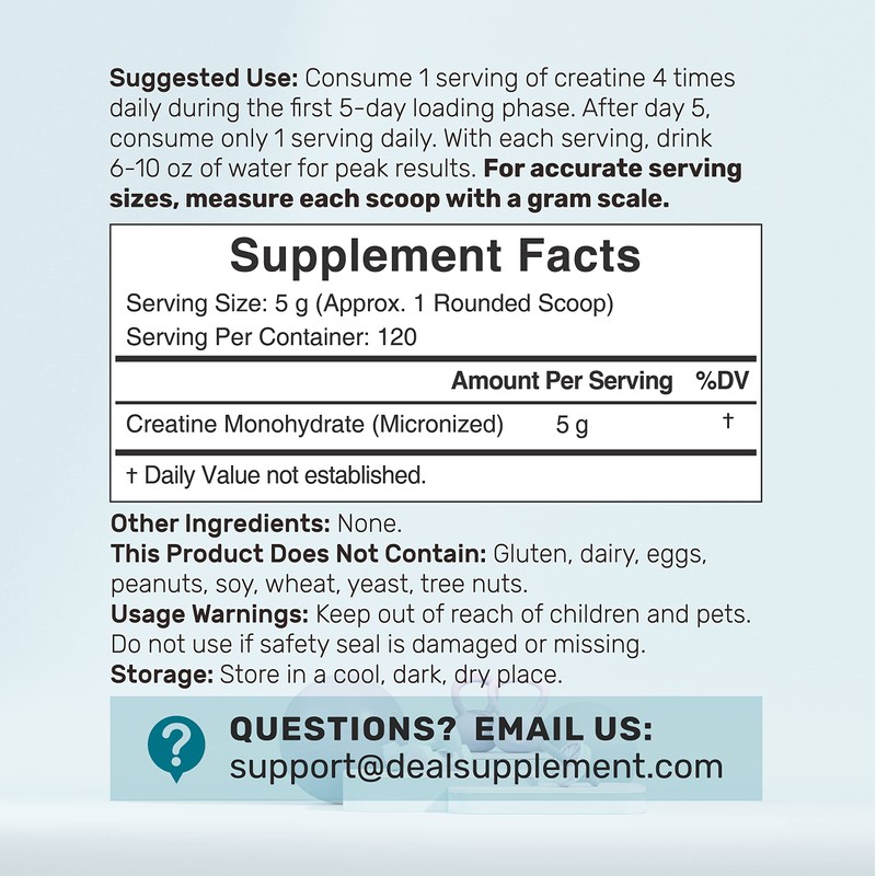 - The most efficient monohydrate form that supports muscle contractions, energy production, and lean muscle mass maintenance. Deal Supplement's creatine jar offers 600g of this powerful performance supplement with 120 servings of a 5000mg dose. The micronized particles are broken down into a fine powder so you can mix it or combine it with other workout supplements for top level training.