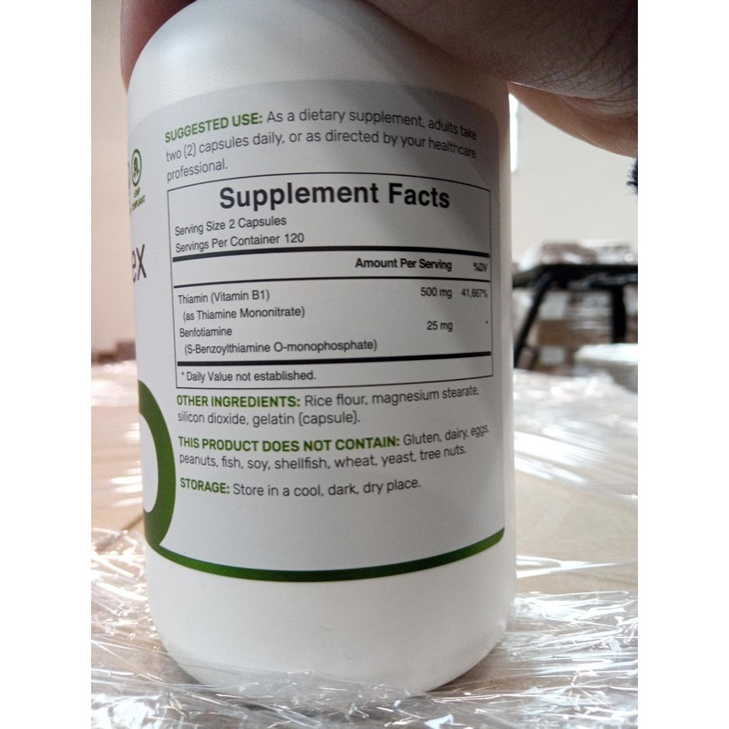 - 240 capsules per bottle. 2 capsule serving size. Thiamine 500mg fortified with benfotiamine 25mg. 120 servings